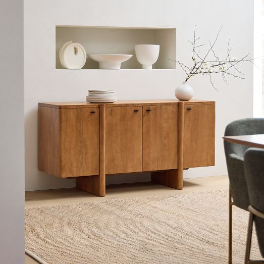 Kiln-dried solid mango wood frame and base. The mango wood used on this product is sustainably sourced from trees that no longer produce fruit. 4 doors open to 2 cabinets with 1 adjustable shelf in each.
